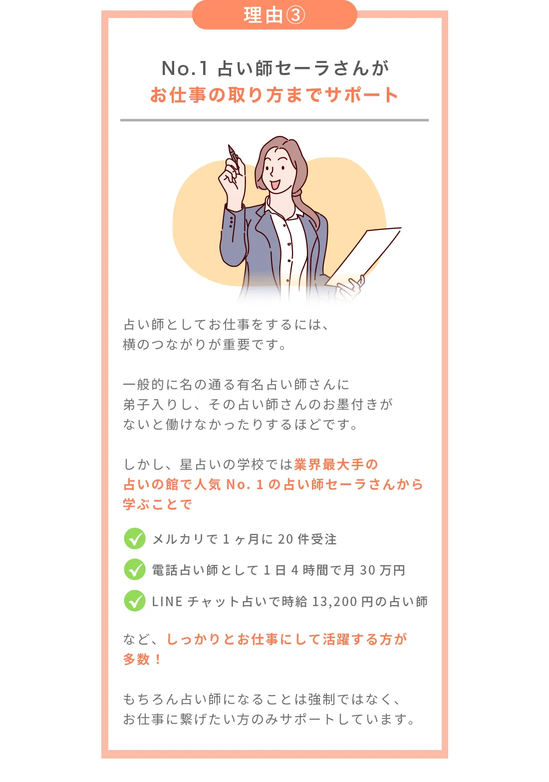 セーラ先生の講座は教えて終わりではなく、お仕事にしたい方のサポートもあるので時給13,200円の占い師としてデビューも出来ました。