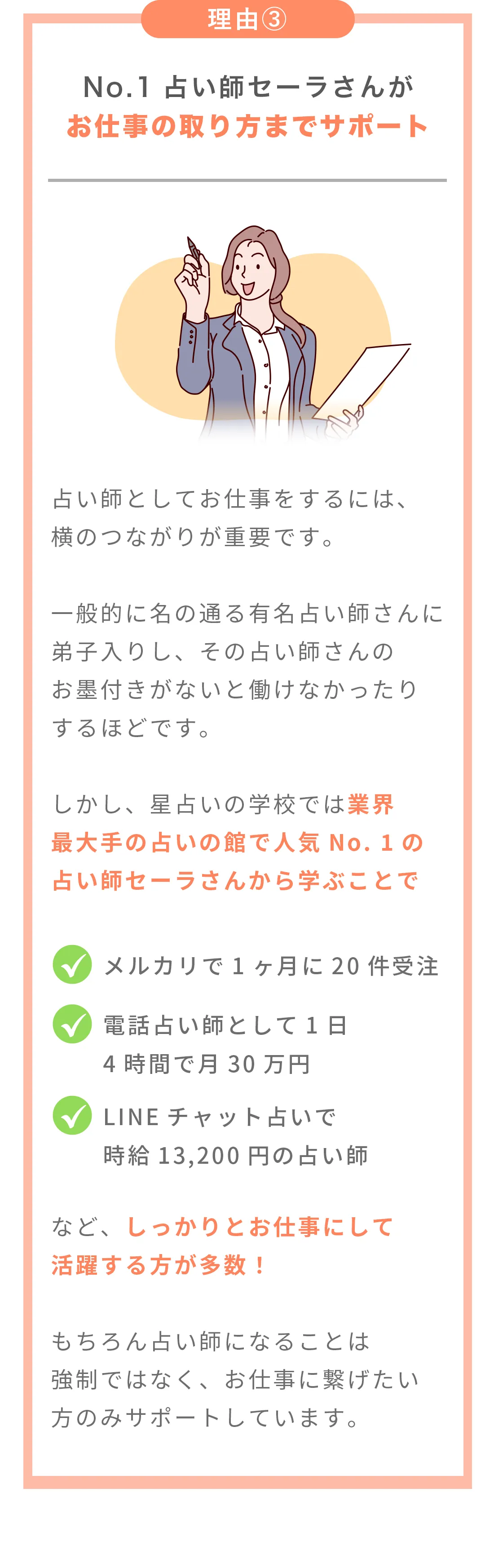 セーラ先生の講座は教えて終わりではなく、お仕事にしたい方のサポートもあるので時給13,200円の占い師としてデビューも出来ました。