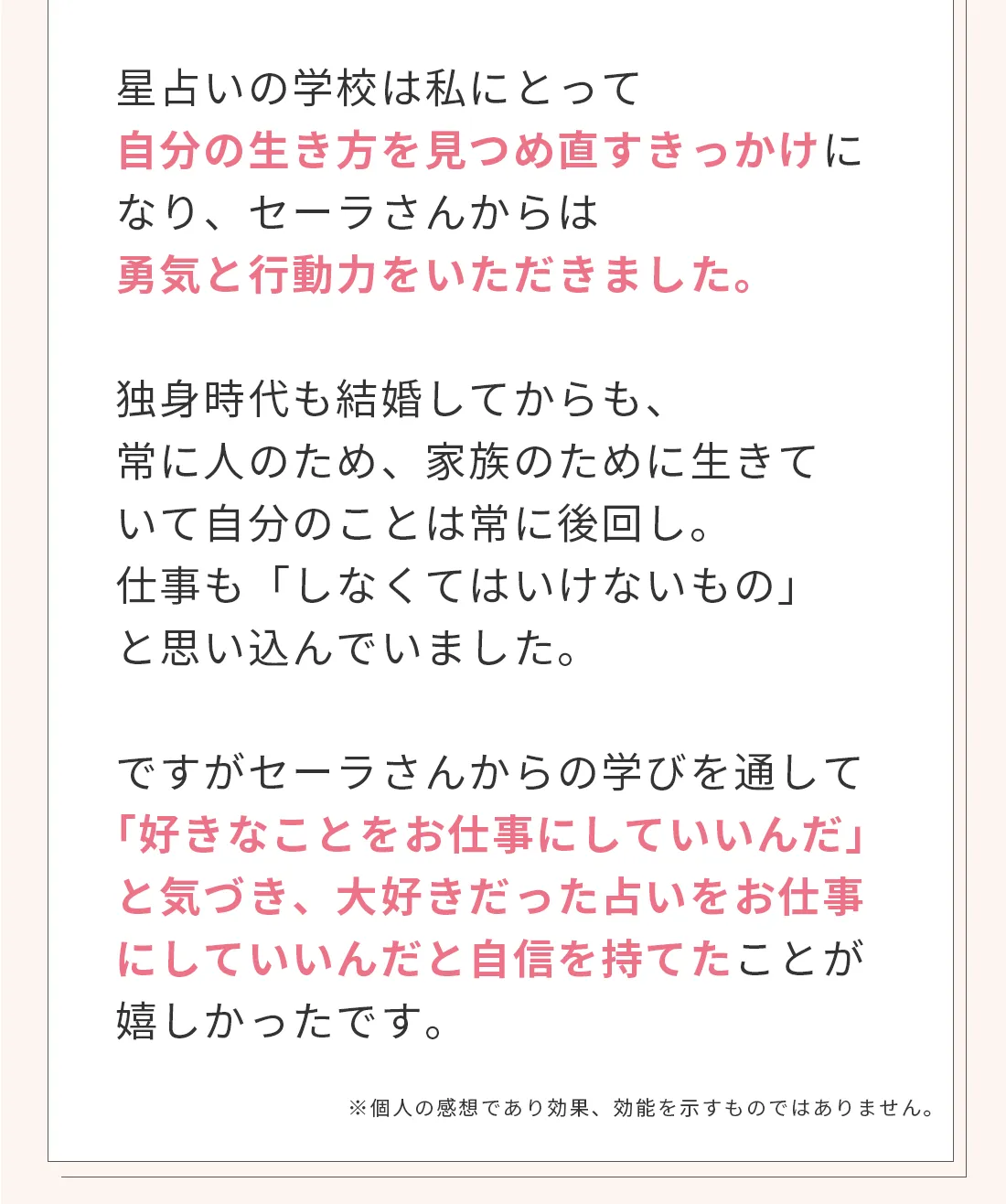 セーラ先生の講座は教えて終わりではなく、お仕事にしたい方のサポートもあるので安心して占い師デビューができ、今では天職となっています。